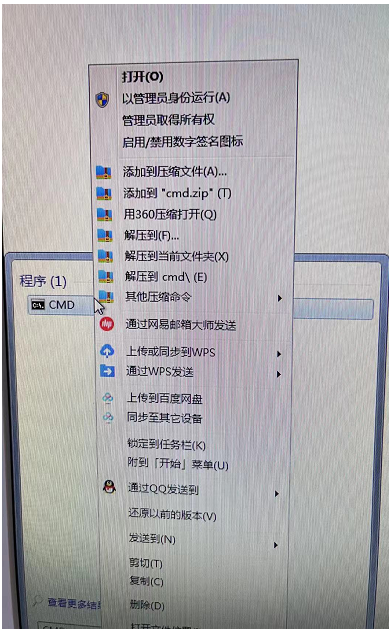 1、在開始菜單搜索CMD后,鼠標右鍵選擇“以管理員模式運行”;