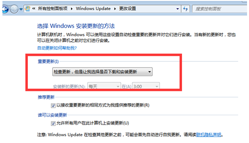 6、把“重要更新”中的選項改為“檢查更新,但是讓我選擇是否下載和安裝更新”,最后點擊確定,然后重新給win7系統還原即可。
