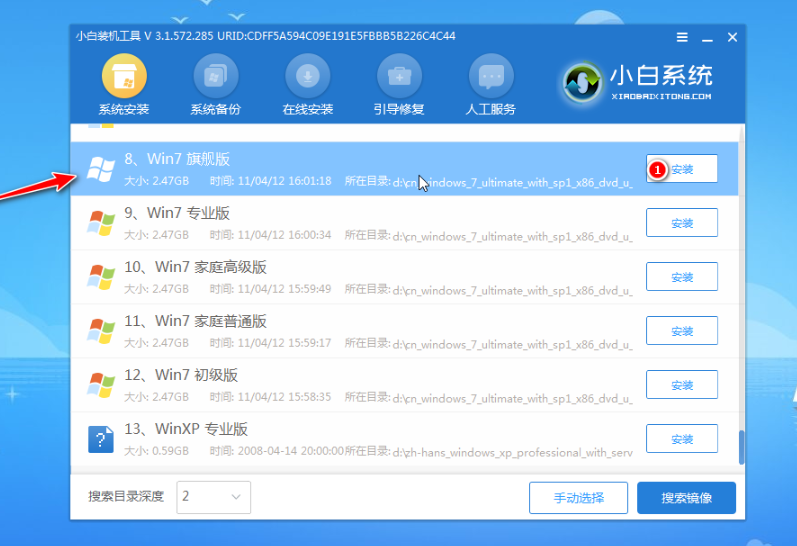 5、打開小白裝機工具,選擇win7系統點擊安裝到系統盤c盤。
