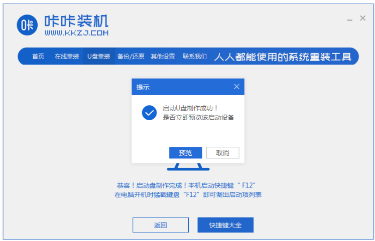 3、裝機軟件將會自動開始制作u盤啟動盤,完成后快速預覽需要安裝的電腦的啟動快捷鍵,再拔出u盤。