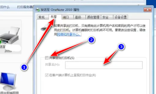6、在出現的對話框里面選擇共享,然后把共享這臺打印機前面的方框打上對勾,共享的打印機名稱,最后點擊確定即可。