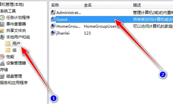 2、然后出現【計算機管理】對話框,我們選擇本地【用戶和組】,然后在右側出現的列表中,雙擊guest訪客。