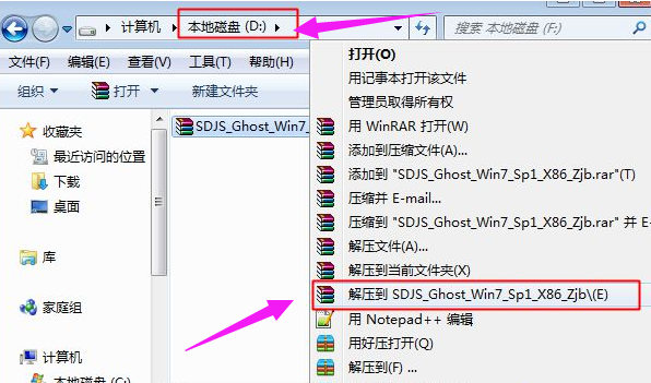 1、首先我們需要備份好電腦C盤及桌面重要文件,下載好ghost系統鏡像文件,準備一個、一鍵還原ghost工具。然后我們將ghost系統鏡像解壓到除C盤外的其他磁盤里面,保證磁盤空間足夠解壓。右鍵使用WinRAR等工具解壓出來。