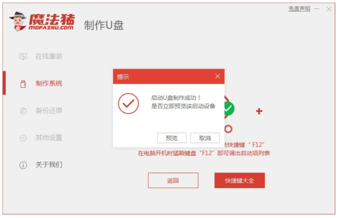 3、耐心等待裝機軟件制作u盤啟動盤成功之后,可以先預覽需要安裝的電腦主板的啟動熱鍵,再拔掉u盤退出。