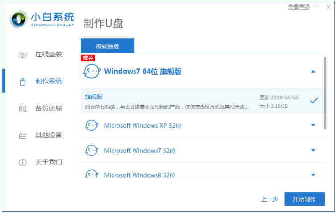 2.選擇本次需要安裝的win7系統,點擊“開始制作”。