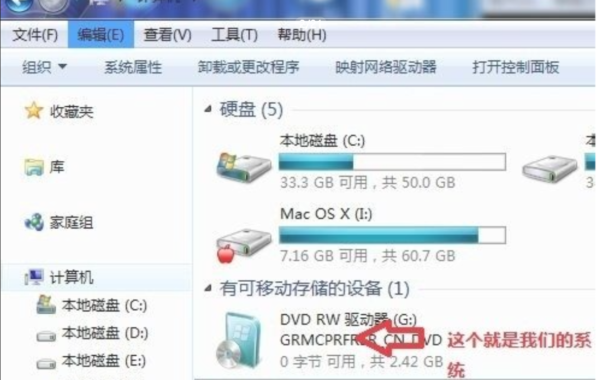 1、先要準備一個4.7G的DVD空盤,然后刻錄一個系統Win7(ios的文件格式)到你光盤上,然后把系統光盤放入光驅中去。