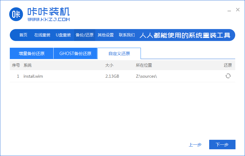 1、雙擊打開咔咔裝機軟件,點擊GHOST備份還原,找到自定義還原功能后會自動搜索,點擊下一步。