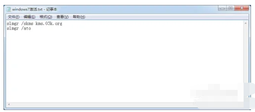 2、打開我們新建得windows7激活文本文檔,在文檔內輸入slmgr /skms kms.03k.org slmgr /ato輸入完畢后,點擊右上角X符號關閉文本文檔窗口。