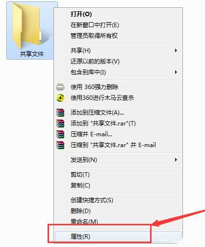 在共享的文件夾上點 擊鼠標右鍵,然后選擇“屬性”;