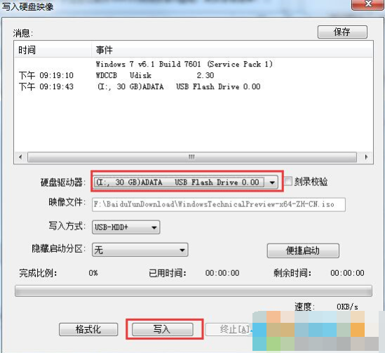 3、這時會彈出“寫入硬盤鏡像”窗口,確定好磁盤驅動器一項為你的U盤后,點擊寫入,中間出彈出格式化的提示,我們確認一次就好了。