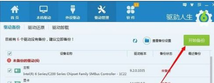 2.體檢之后再對需要驅動的先備份;點擊驅動管理再點擊開始備份,備份后再對需要的進行升級或者重新安裝就可以了。