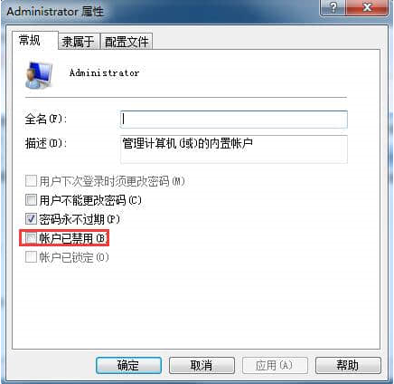 3、在Administrator屬性的界面中,將“賬戶已禁用”的勾選項去掉點擊應用及確定即可。