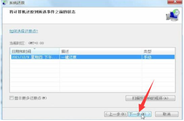5、然后根據提示選擇還原點,點擊下一步進入還原操作。