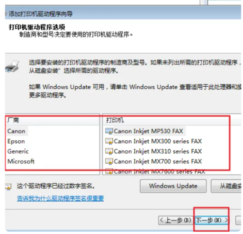 5、新的頁面中選擇要安裝的打印機驅動的制造商和型號,繼續點擊下一步。