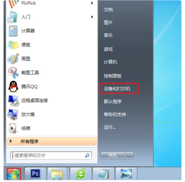 1、選擇電腦開始菜單,選擇設備和打印機選項,進入頁面。