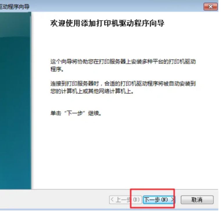 4、系統出現添加打印機驅動程序向導,點擊下一步。