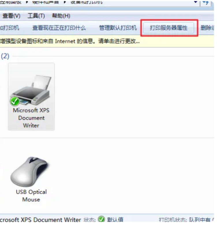2、設備和打印機頁面中,點擊“打印服務器屬性”選項,進入頁面。