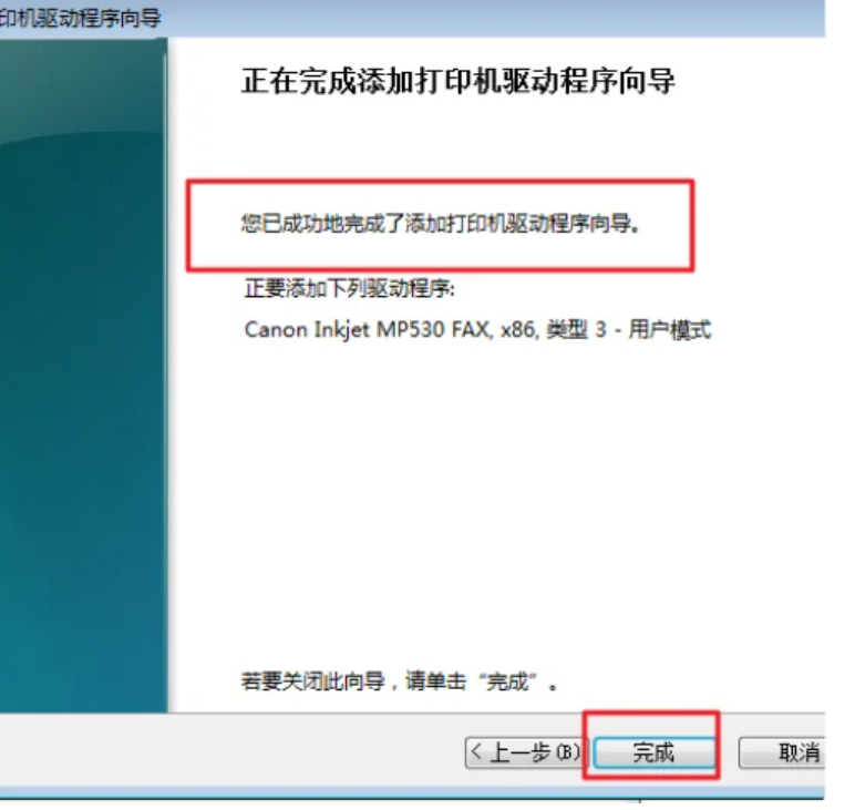 6、系統提示成功完成了添加打印機驅動程序向導,選擇完成按鈕,打印機就安裝成功了。