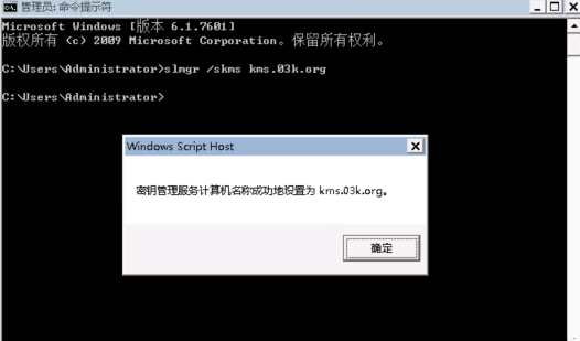 隨即提示“密鑰管理服務計算機名稱成功地設置為kms.03k.org”,點擊“確定”即可。