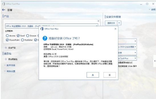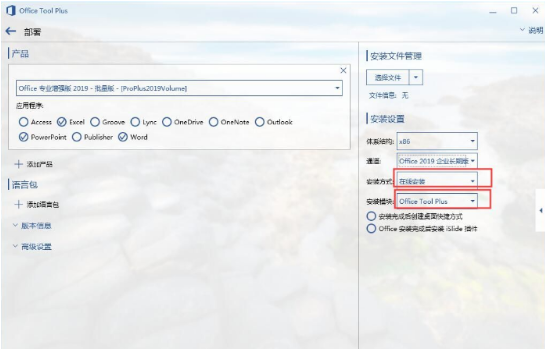 2、打開之后,選擇Office專業增強版2019-批量版,然后勾選要安裝的組件,這里只選擇安裝三套件,右側安裝方式選擇在線安裝、安裝模塊默認Office tool plus。點擊開始部署;(注,通道選擇半年通道即可)。