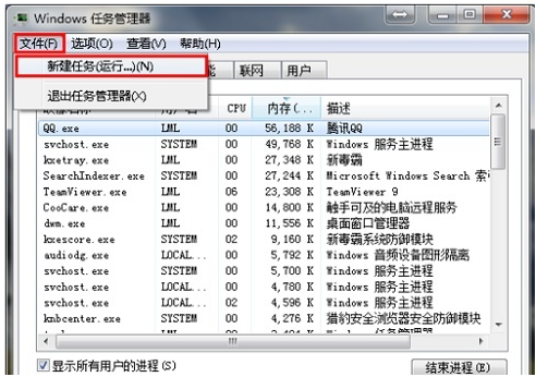2、在“windows任務管理器”的在最上方的菜單欄中點擊“文件”,再選擇“新建任務(運行)”。