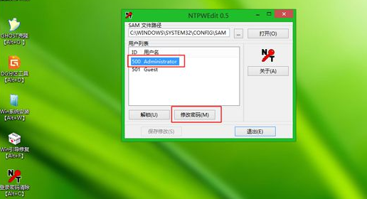 4、這時候會列出當前系統的用戶名,選擇需要修改密碼的用戶名,比如Administrator,點擊【修改密碼】,如果不能修改,則先點擊解鎖,保存修改;