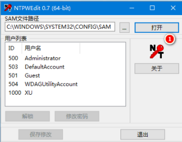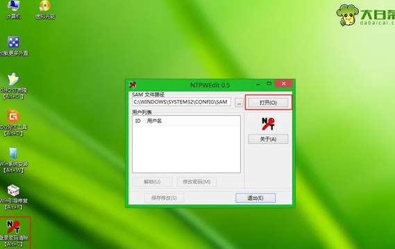 3、進入pe系統之后,雙擊桌面上的【登錄密碼清除】圖標,彈出NTPWedit對話框,默認會顯示保存密碼的SAM文件路徑,直接點擊【打開】;