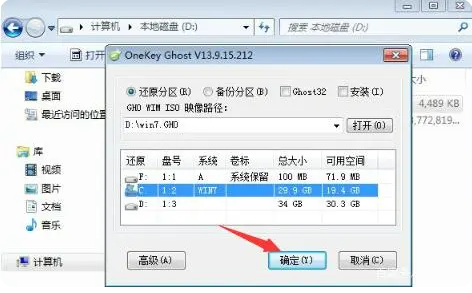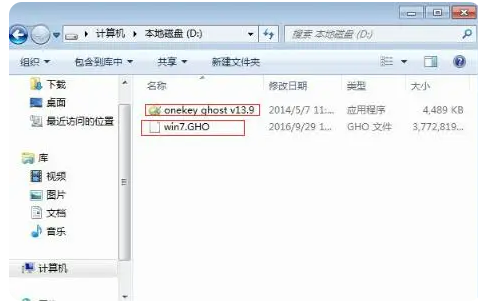 2.將最大的win7.gho文件和Onekeyghost工具放在同一目錄中,如D盤,不放C盤或桌面;