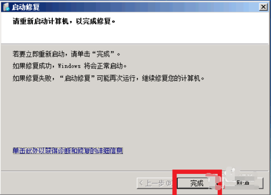 4、點擊Finish,系統修復完成,重啟正常??梢越鉀Q非法關機等一般問題。