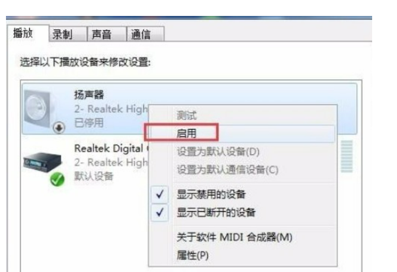 3、在播放下,右鍵點擊“揚聲器”,選擇“啟用”。