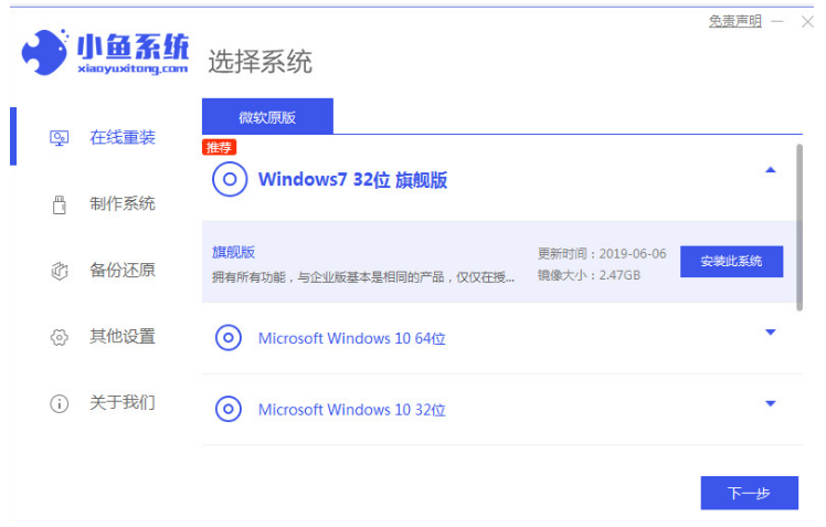 1、首先在電腦上下載安裝好小魚一鍵重裝系統工具并打開,選擇需要安裝的win7系統,點擊進入下一步。