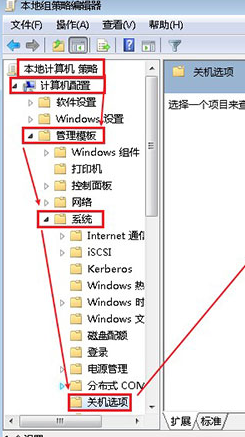 2、按照順序打開:本地計算機 策略--計算機配置--管理模板--系統--關機選項