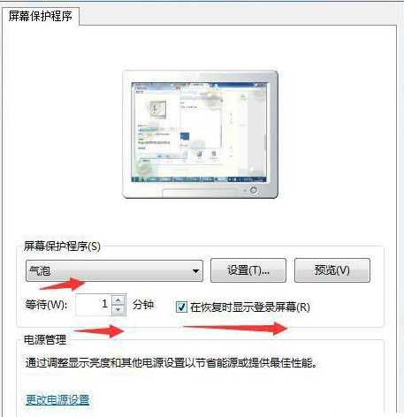 4、點擊屏幕保護程序,在彈出的窗口中選擇屏幕保護程序并設定時間。關鍵時要勾選上在恢復時顯示登錄屏幕,設定完成后點擊確定。保持電腦1分鐘的時候不要進行任何的操作。