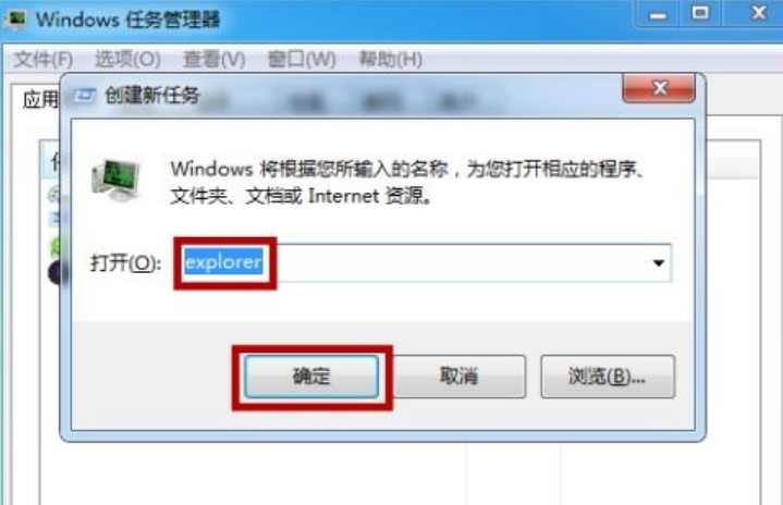 8、輸入“explorer.exe”,最后點擊確定即可。