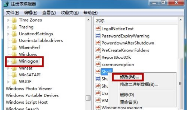 7、在右邊找到“shell”,右鍵選擇“修改”。