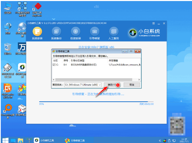 6、當引導修復工具彈窗彈出界面的時候默認修復C軟件之后選擇windows7系統,點擊安裝。
