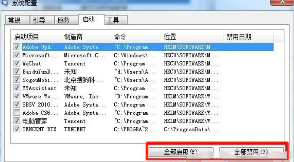 4、如果要啟動或全部禁用,可以單擊下面的“全部啟動”或“全部禁用按鈕”。如果項目不想選擇,請單擊前面的小盒子。
