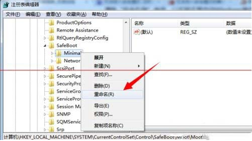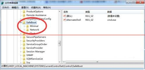 2、從打開的“注冊表編輯器”界面中,依次進入“HKEY_LOCAL_MACHINE\SYSTEM\CurrentControlSet\Control\SafeBoot”,在此可以看到“Minimal”及 “Network”項。如圖所示。