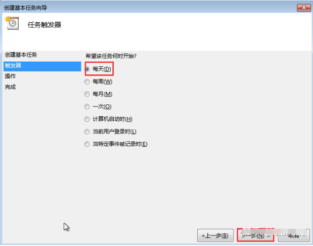 4、來到“創建基本任務向導”對話框,根據自身需要選擇定時關機的頻率,點擊“下一步”。