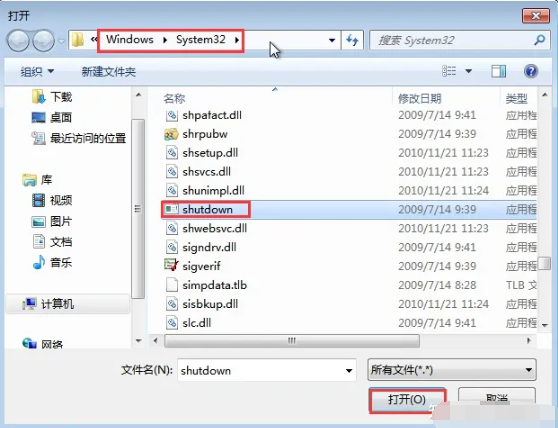 7、此時會彈出“啟動程序”的對話框,點擊“瀏覽”,按照“Windows——System32——shutdown”路徑找到并打開。