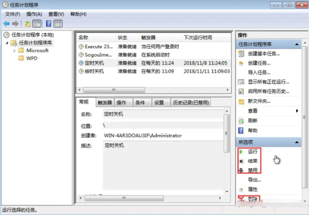 11、點擊“完成“后就成功設置定時關機了,在”任務計劃程序庫“中我們能找到添加的任務,如果想要運行、刪除等操作時,雙擊”定時關機“,在彈出窗口右側的”選項下方“可進行操作。