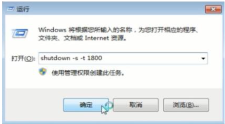 2、輸入命令“shutdown -s -t 1800”(這里的1800為1800秒,想要設置多少小時后關機就設置3600乘以小時數),按下回車鍵或鼠標點擊“確定”執行命令。