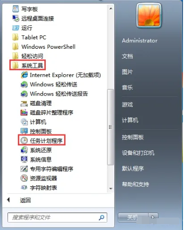 1、點擊桌面的開始菜單,在所有程序中依次打開“附件——系統工具——任務計劃程序”,點擊“任務計劃程序”。