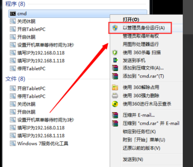 2. 鼠標右鍵點擊CMD.exe,選擇以管理員身份運行。