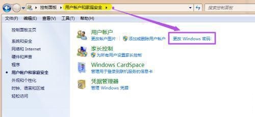 3、然后在新打開的‘用戶帳戶和家庭安全’頁面中點擊‘更改windows密碼’。