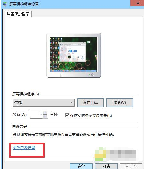 03在打開的“屏幕保護程序”窗口中,選擇一種屏幕保護程序,如“氣泡”,點擊”更改電源設置“。
