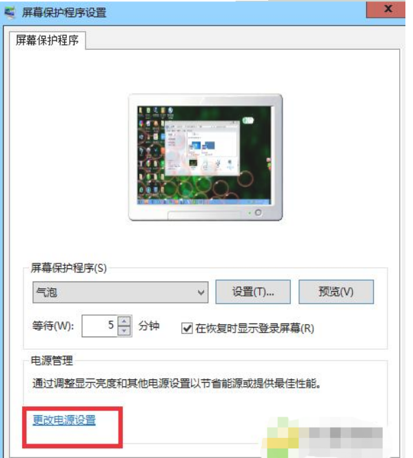 03在打開的“屏幕保護程序”窗口中,選擇一種屏幕保護程序,如“氣泡”,點擊”更改電源設置“。