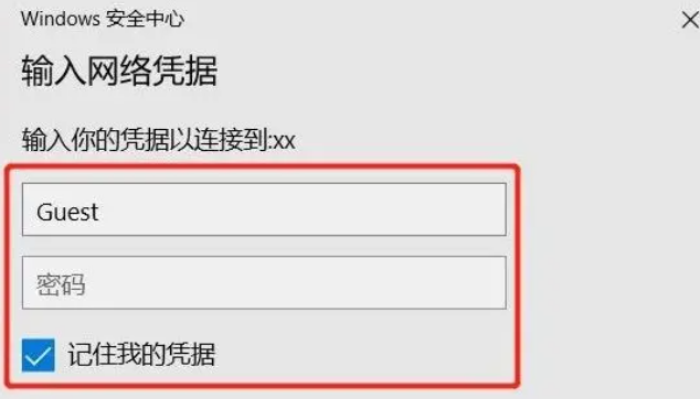 3、在彈出的界面里,依次填寫用戶名:Guest,密碼不用填,然后勾選記住我的憑證。