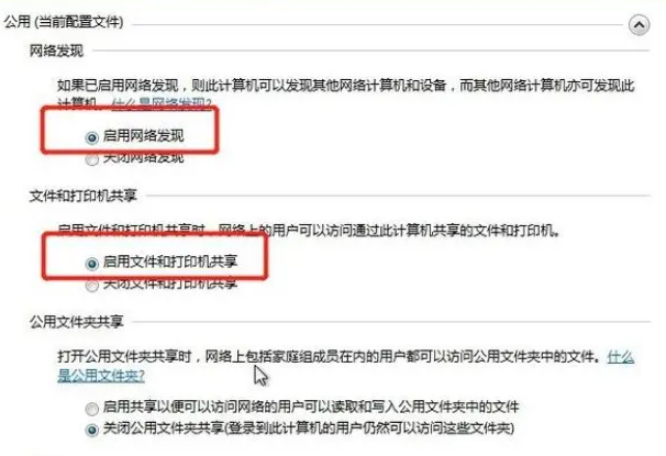 7、選中對應的網絡,小編的網絡是公用網絡,那就選公用網絡設置,分別勾選【啟用網絡發現】、【啟用文件和打印機共享】、【關閉密碼保護共享】。