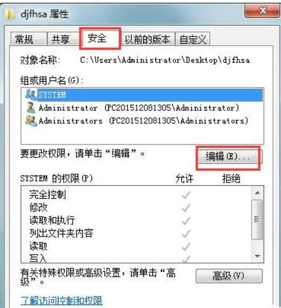 2、在文件夾的屬性當中切到【安全】,點擊【編輯】